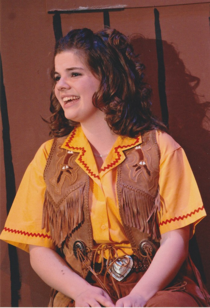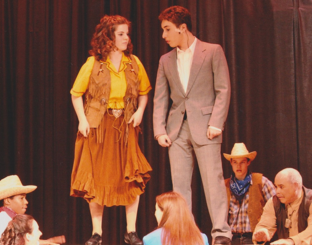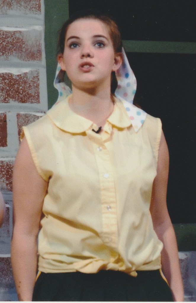 Her middle school experience, sadly, was traumatic. She came from a Catholic school and was thankful to enter the public school, even though she had no friends to back her up. She did have her brother, Billy, who was her rock. He had a great experience in the the public school and that gave her all the fortification she needed. She auditioned for the fall show as a freshman and got an understudy, an unexpected opportunity which bolstered her confidence immensely. She was the only freshman in a cast of primarily juniors and seniors, and she decided to dig in and do her part. What she also didn’t expect was to be taken under everyone’s wing and completely supported by every member of the company: cast, crew and adults.